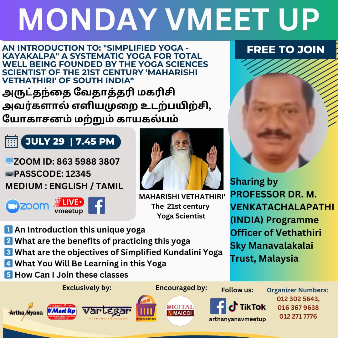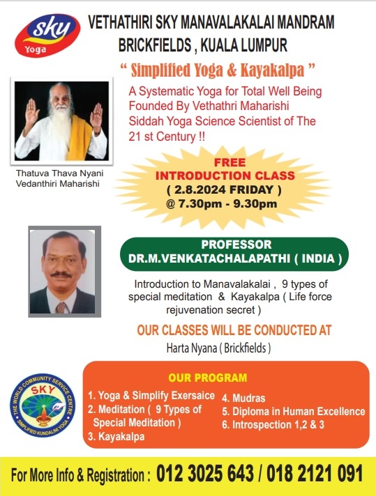 PROFESSOR DR. M. VENKATACHALAPATHI (INDIA) has created 50 Manavalakalai yoga graduates and 125 Yoga Teachers in Malaysia. They are now teaching yoga to nearly 40 schools, University and Prisons in Malaysia. With his 21 over years experience in Manavalakalai yoga he has created 500 Manavalakalai yoga graduates in Chennai Kaladipet Manavalakalai trust India. He is currently doing research to cure diabetes and has also wrote a book of Ariviyal Parvaiyil Vethathiri Maharishi Udal Nala Kolgai.