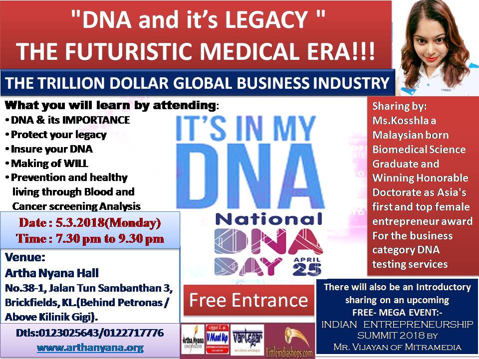 🌈🔬💉 “DNA and it’s LEGACY ” THE FUTURISTIC MEDICAL ERA!!! 💸💵💴 THE TRILLION DOLLAR GLOBAL BUSINESS INDUSTRY ___________ Sharing by: 🙏 Ms.Kosshla a Malaysian born Biomedical Science Graduate and Winning Honorable Doctorate as Asia’s first and top female entrepreneur award For the business category DNA testing services ………. ___________ What you will learn by attending:-…