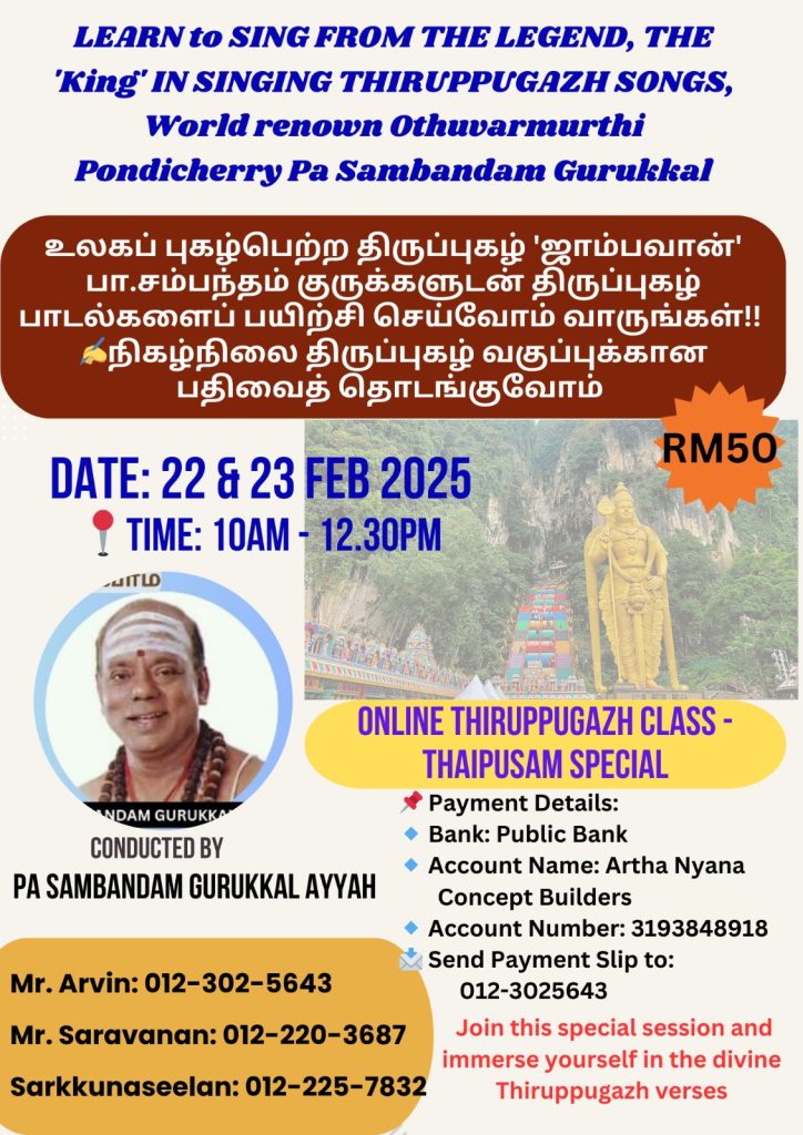 🙏Let’s start our registration for the ONLINE THIRUPPUGAZH CLASS during this auspicious Thaipusam celebration month 🙏