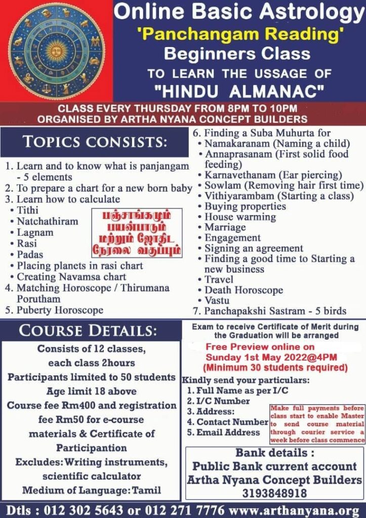 👉New Panjangam class to start from 8pm to 10pm every thursday for 12 Thursday. Those interested to join kindly call the organiser before 10.05.2022 for study material to be posted & 17.05.2022 for student opt for e-course materials.