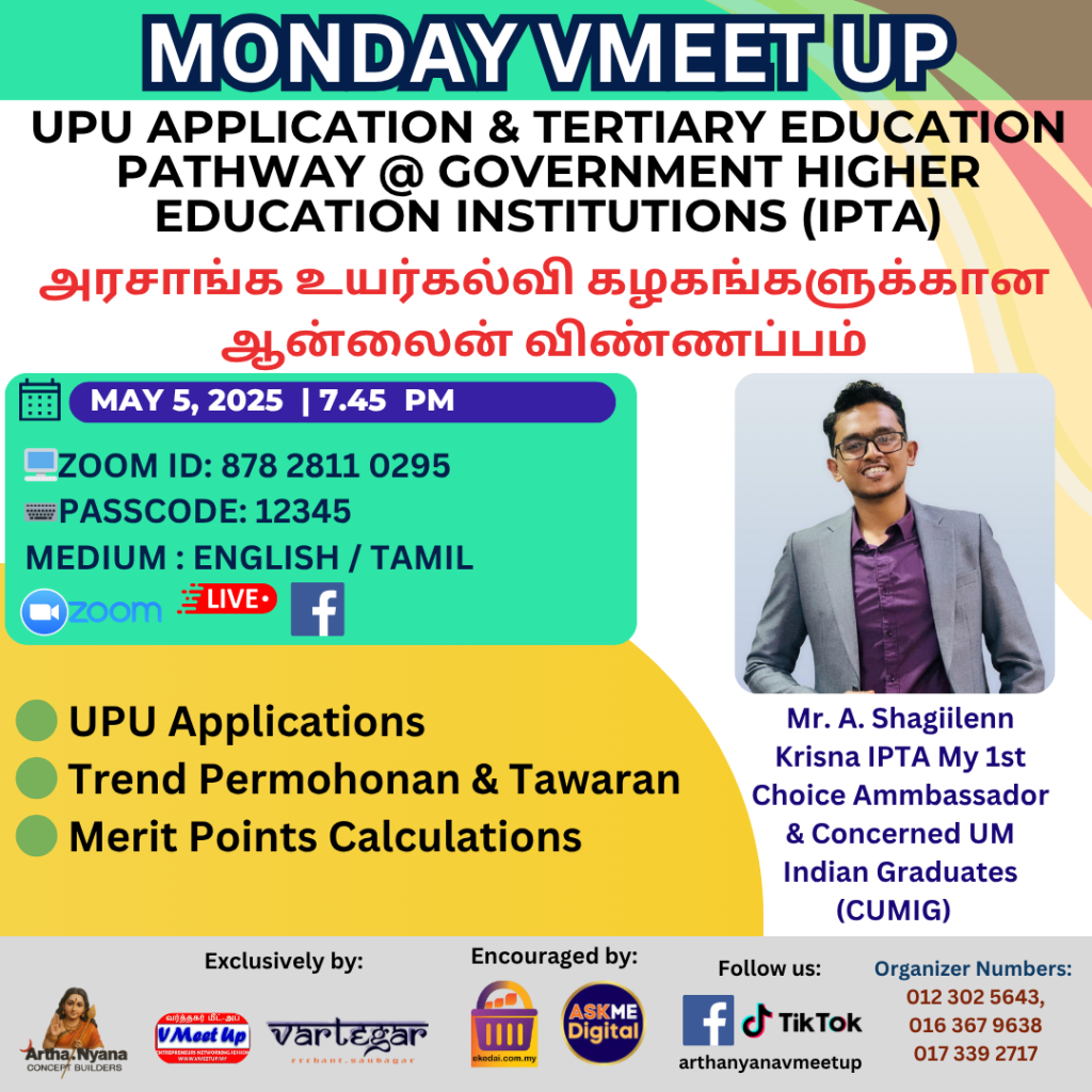 🤝Speaker Details: Mr. A. Shagiilenn Krisna IPTA My 1st Choice Ammbassador & Concerned UM Indian Graduates (CUMIG) 👉 UPU Application & Tertiary Education Pathway @ Government Higher Education Institutions (IPTA)